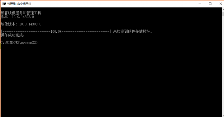3、扫描完以后,博主这里显示的是:未检测到组件存储损坏,操作成功完成。那么恭喜你,系统文件没有损坏,但如果是其他情况,那就要用到另一条命令进行修复了。